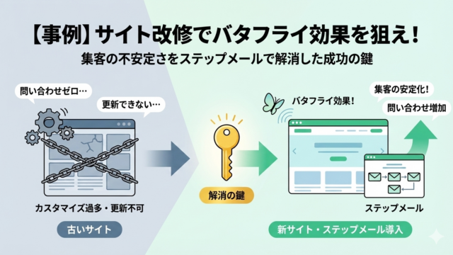 【成功事例】アクセスはあるのに問い合わせゼロ…そんな窮地を「バタフライ効果」を狙ったデザイン改善とステップメールで打破した事例を公開。古いWordPressの呪縛を解き、リスト獲得を自動化して集客を安定させる究極の戦略を解説します。